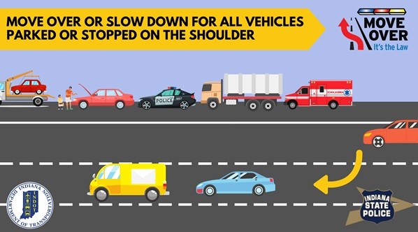 The Indiana Department of Transportation and the Indiana State Police are urging drivers across the Hoosier State to move over and slow down for emergency responders and disabled vehicles with flashing lights activated on the shoulders of highways and interstates.
